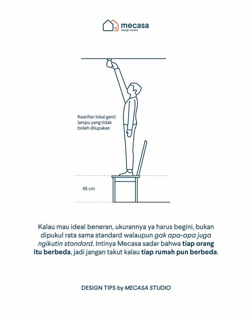 Sebagai tambahan, jangan lupa untuk mempertimbangkan aksesibilitas saat mengganti lampu atau membersihkan plafon. Jarak ideal adalah 45 cm dari plafon agar mudah dijangkau tanpa perlu alat bantu yang rumit.