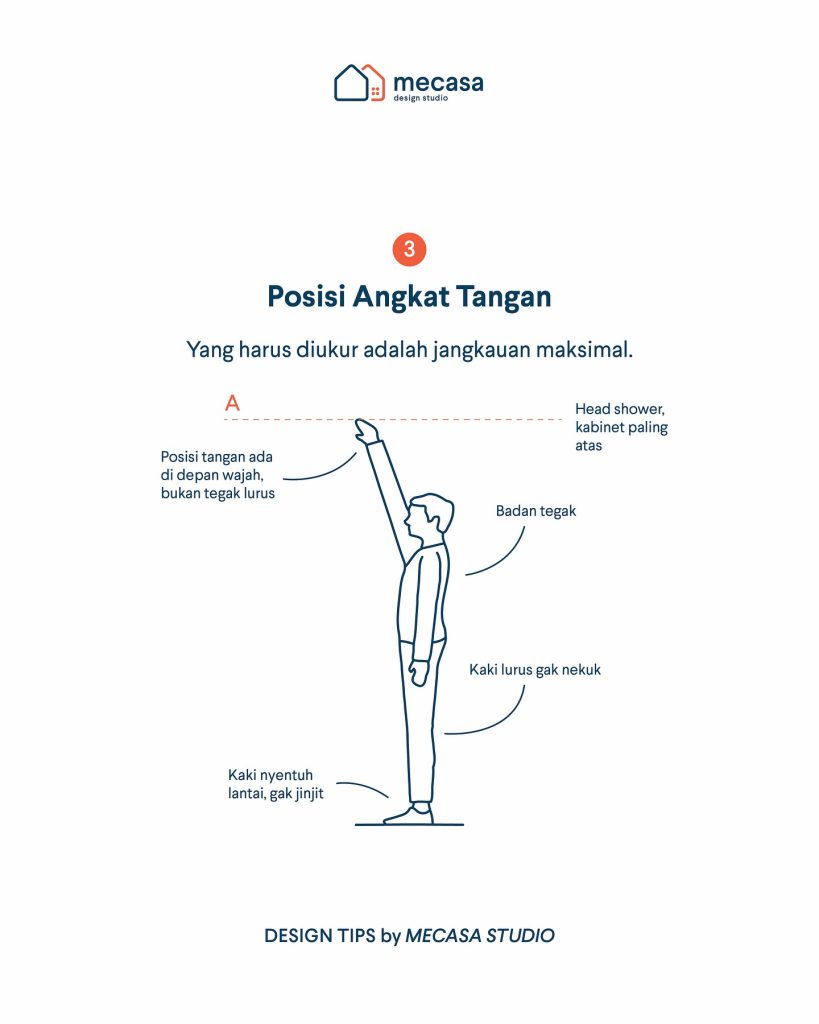 Rekomendasi: Kabinet atas atau head shower idealnya tidak lebih tinggi dari jangkauan maksimal tangan Anda untuk mempermudah penggunaan.