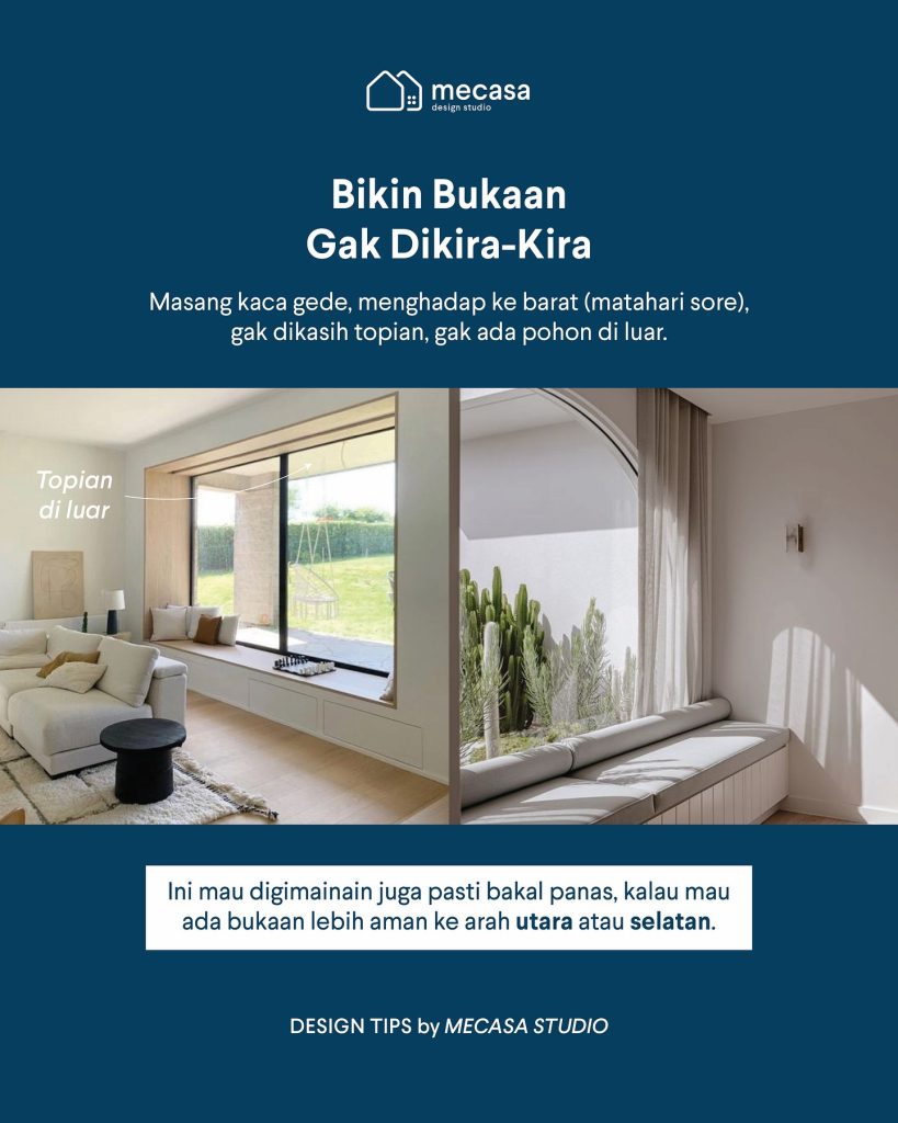 Kesalahan paling umum adalah memasang kaca besar tanpa perhitungan arah matahari. Misalnya, bukaan besar yang menghadap ke barat (arah matahari sore) tanpa pelindung seperti topian atau pohon di luar.