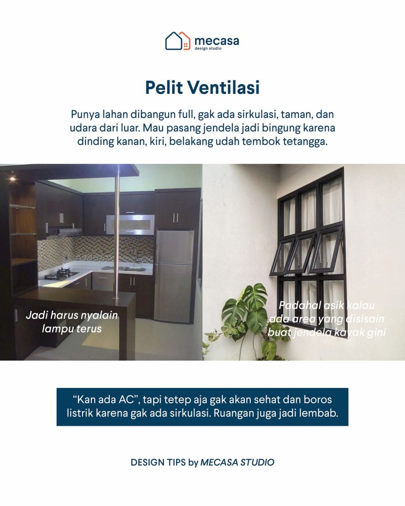 Punya lahan kecil sering kali membuat orang memaksimalkan bangunan hingga lupa menyediakan ruang untuk ventilasi. Hasilnya, tidak ada sirkulasi udara yang baik, ruangan jadi lembap, harus bergantung pada AC, dan lampu harus menyala sepanjang waktu.