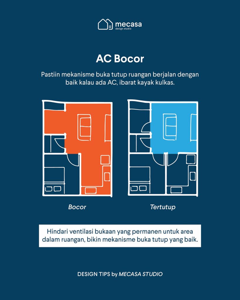 Memasang AC bukan solusi utama jika mekanisme sirkulasi udara dalam ruangan tidak berjalan dengan baik. Bukaan permanen yang tidak bisa ditutup membuat AC bekerja lebih keras, boros listrik, dan ruangan tetap terasa panas.