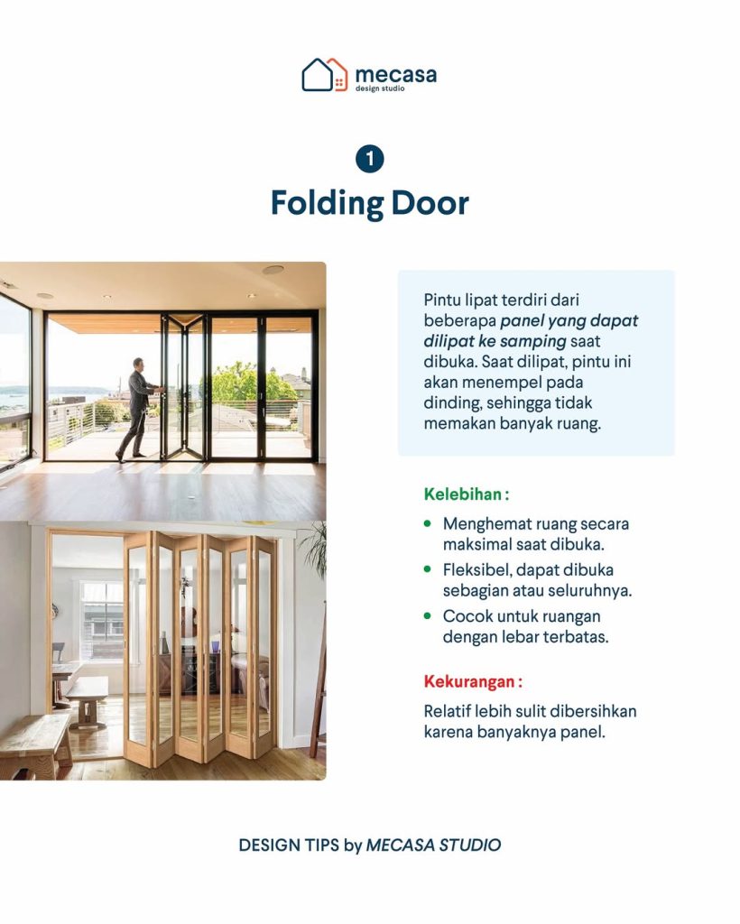 Pintu lipat terdiri dari beberapa panel yang bisa dilipat ke samping saat dibuka. Ketika dilipat, pintu ini menempel pada dinding sehingga tidak menghabiskan banyak ruang.