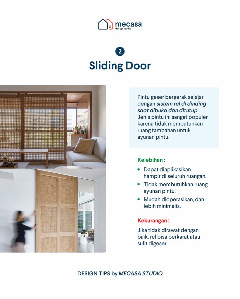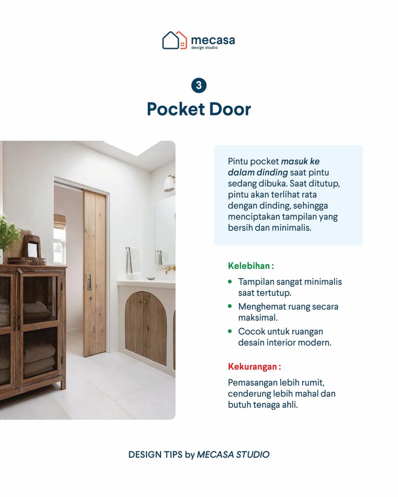 Pintu pocket bekerja dengan cara masuk ke dalam dinding saat dibuka. Saat tertutup, pintu ini tampak rata dengan dinding, memberikan tampilan yang lebih bersih dan modern.