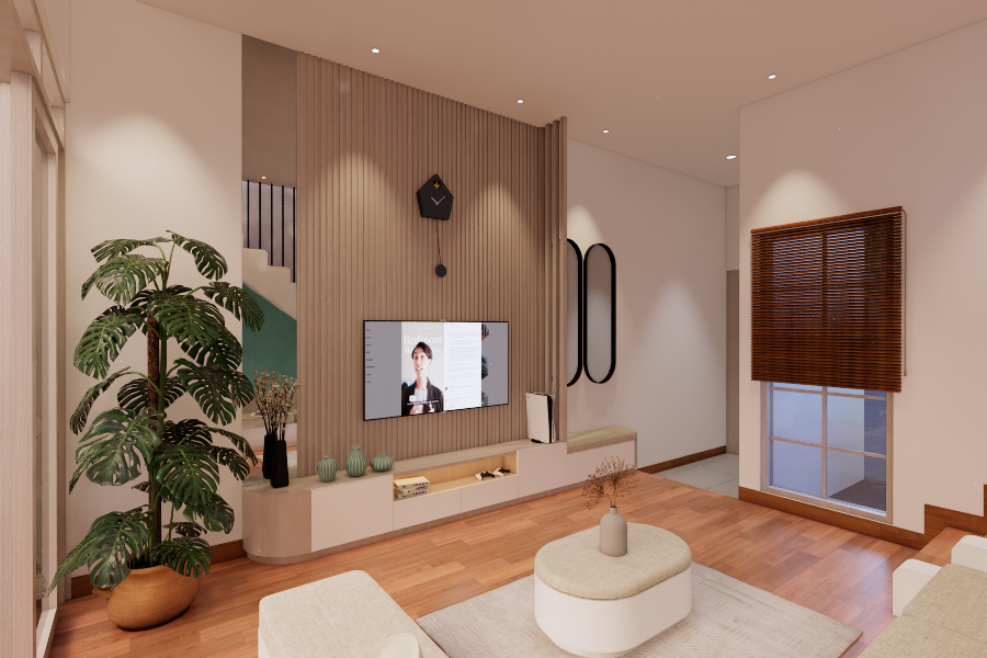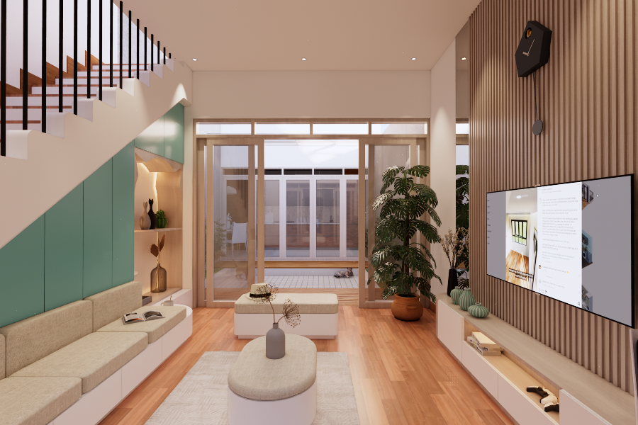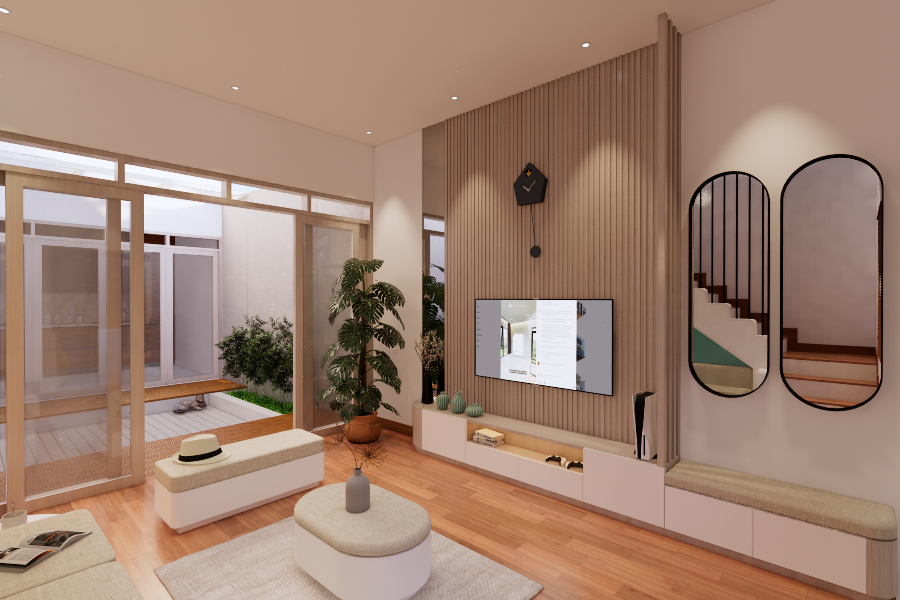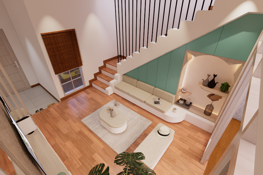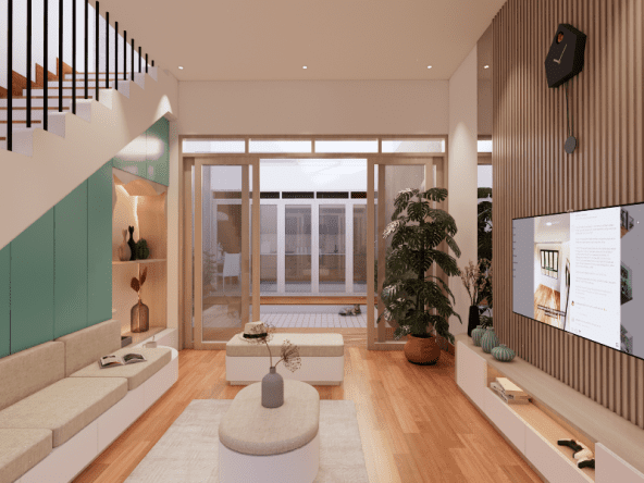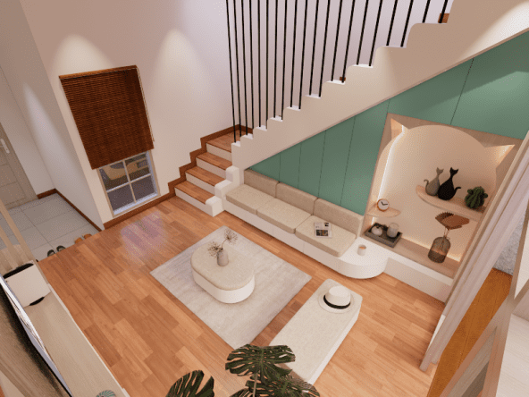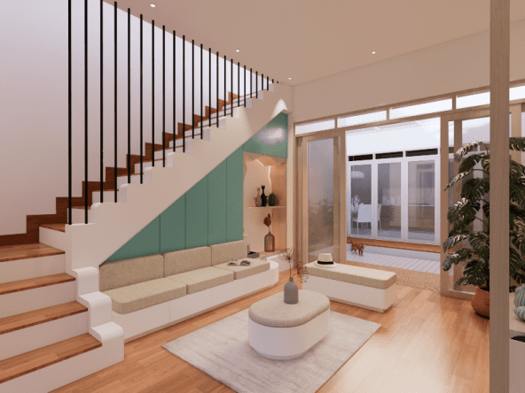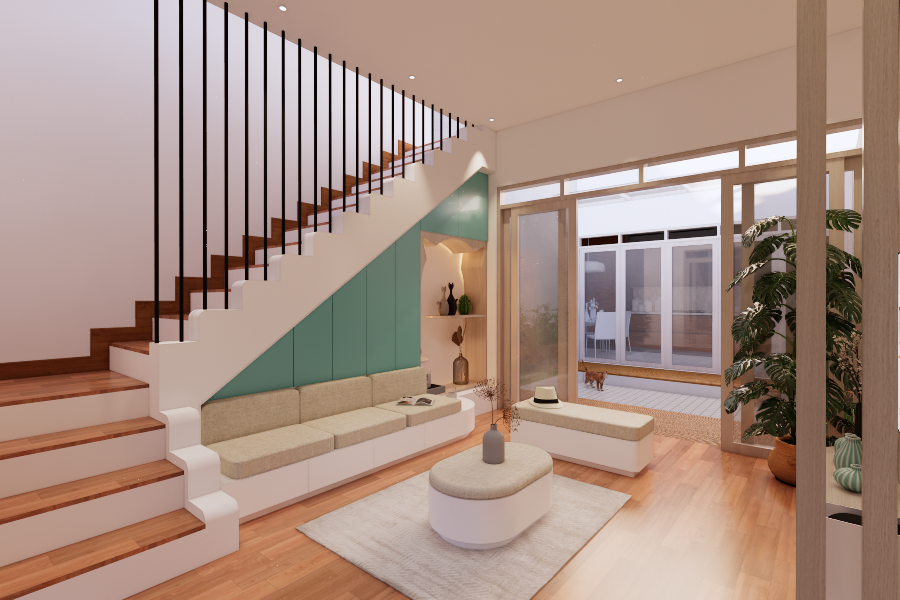 Living room dengan style Scandinavian. Didesain simple untuk menemani saat-saat santai sambil menonton TV dan menikmati suasana di area tengah rumah dan pemanfaatan area bawah tangga. Dengan tone hijau, lantai tone kayu, dan model furniture yang simple. Dengan ukuran 3 x 4 meter, area ini semakin nyaman dilengkapi dengan sofa bench 3-seat, kursi puff, backdrop TV wall panel, TV table dan mounted LCD TV.
