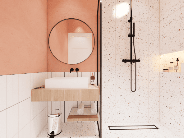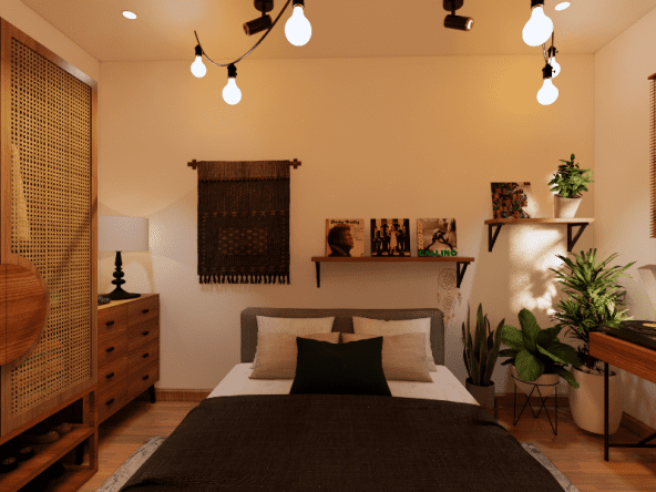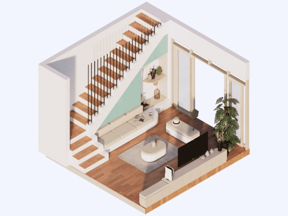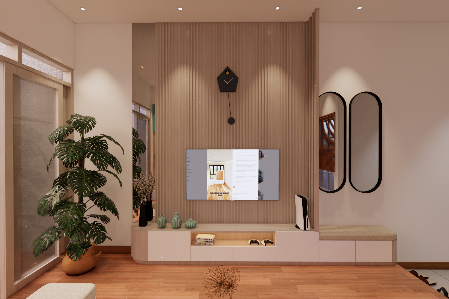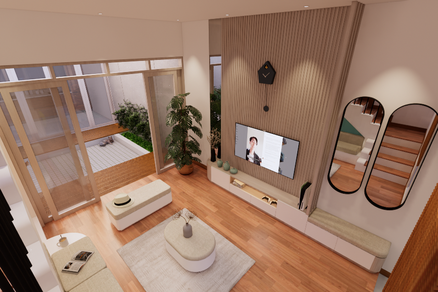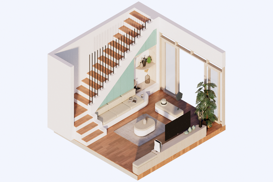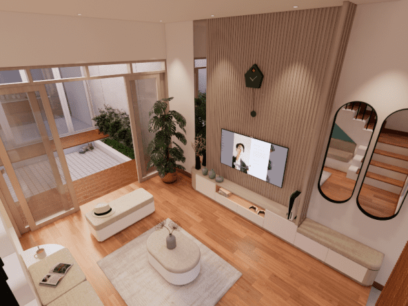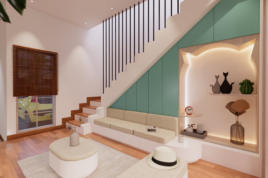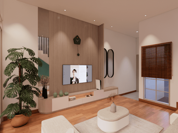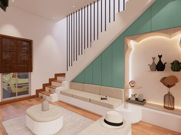 Living room dengan style Scandinavian. Didesain simple untuk menemani saat-saat santai sambil menonton TV dan menikmati suasana di area tengah rumah dan pemanfaatan area bawah tangga. Dengan tone hijau, lantai tone kayu, dan model furniture yang simple. Dengan ukuran 3 x 4 meter, area ini semakin nyaman dilengkapi dengan sofa bench 3-seat, kursi puff, backdrop TV wall panel, TV table dan mounted LCD TV.